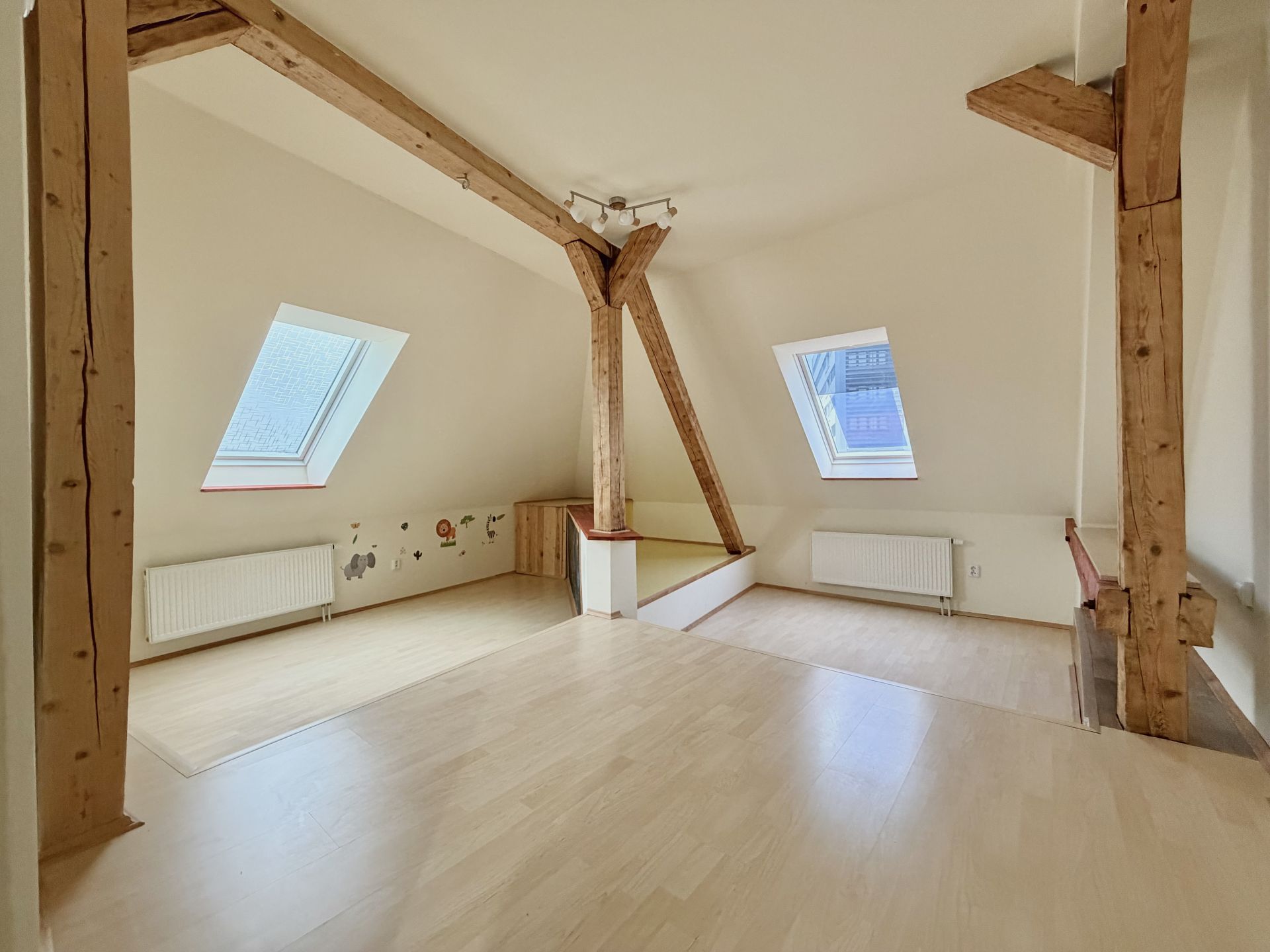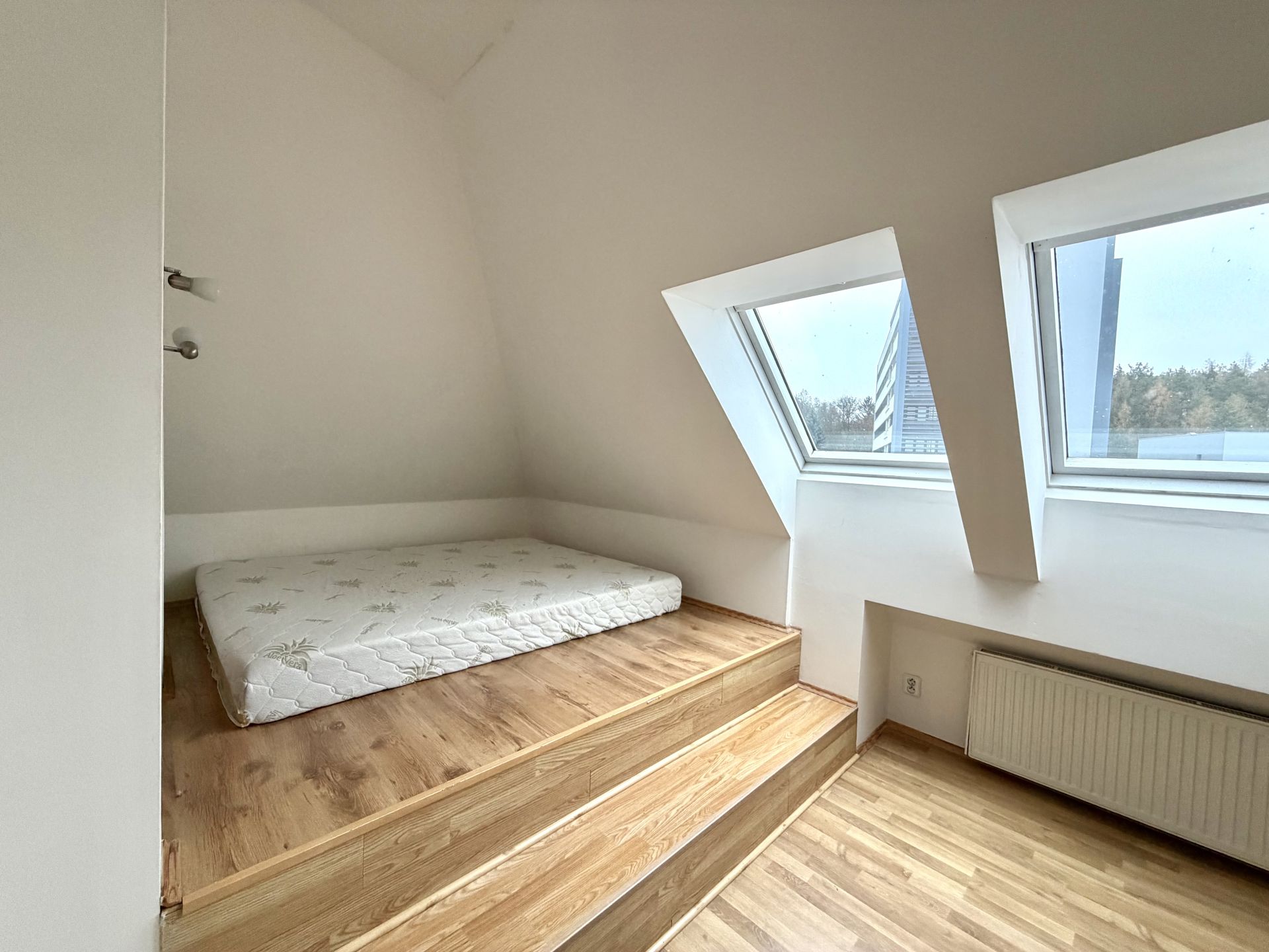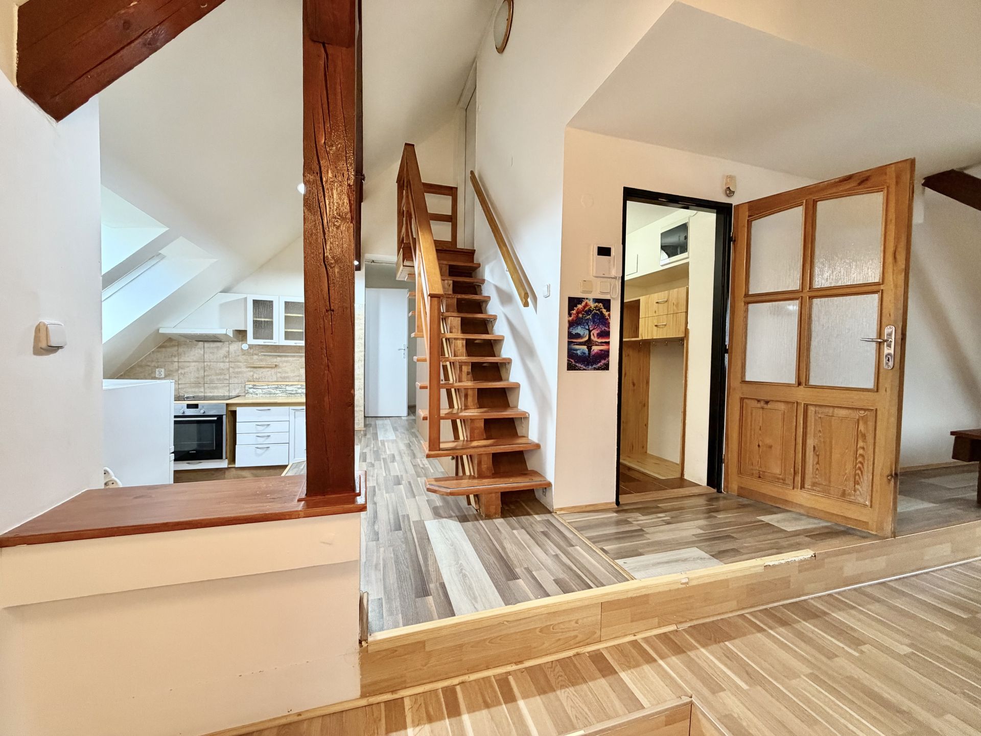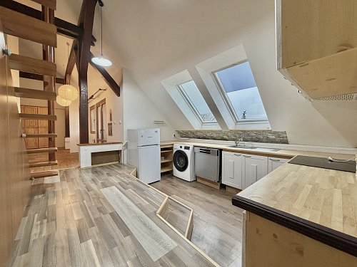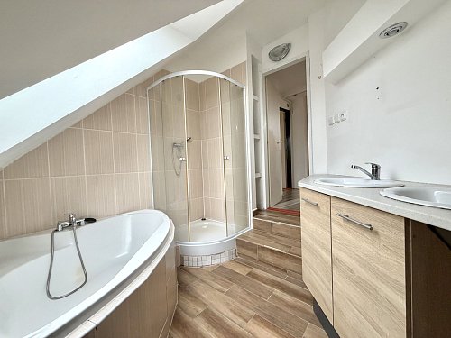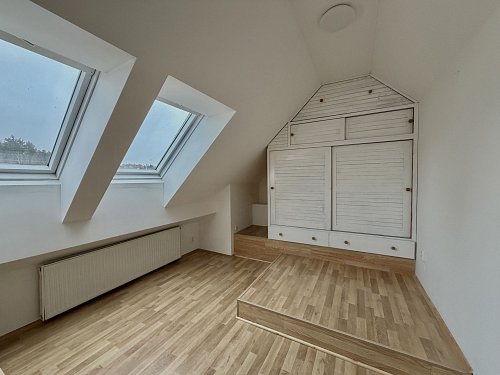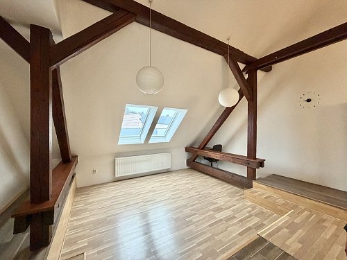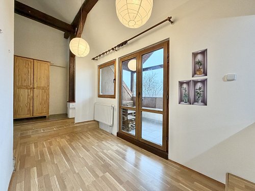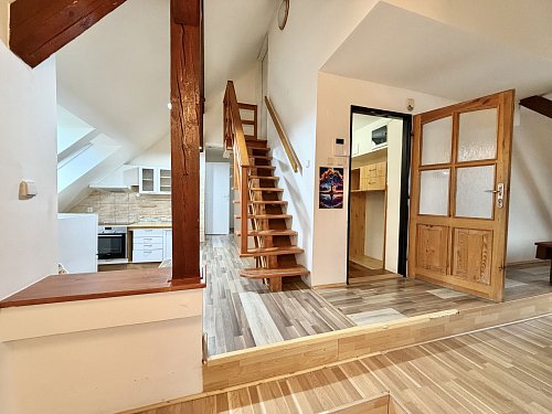 Pronájem podkrovního mezonetového bytu s terasou a zahrádkou. Netradiční podkrovní mezonetový byt ve 3. patře bez výtahu, v ulici Dukelských hrdinů v Rakovníku, přímo naproti nemocnici. Lokalita nabízí výbornou dostupnost centra města, služeb i veřejné dopravy. Hlavní předností bytu je prostorná terasa orientovaná do klidného dvora, která poskytuje příjemné soukromí a prostor pro posezení, pěstování bylinek či zeleniny. K bytu náleží také zahradní domek s malým pozemkem, který je nájemci plně k dispozici. Dvůr je společný pouze pro obyvatele domu. Dům aktuálně prochází renovací – proběhlo odizolování objektu proti vlhkosti a příprava na zateplení. Současný stav je technický, nikoliv konečný; po dokončení prací bude dům výrazně kvalitnější a vizuálně velmi příjemný. Byt je ideální pro zájemce, kteří hledají specifické bydlení s venkovním prostorem a potenciálem.